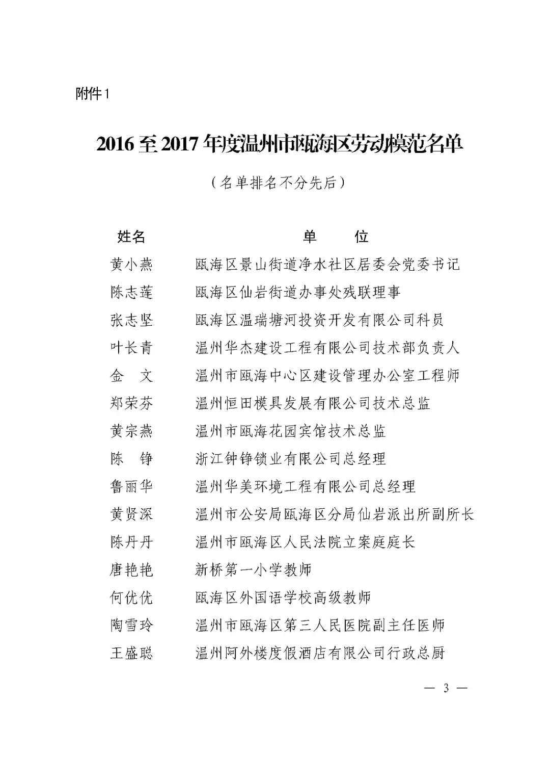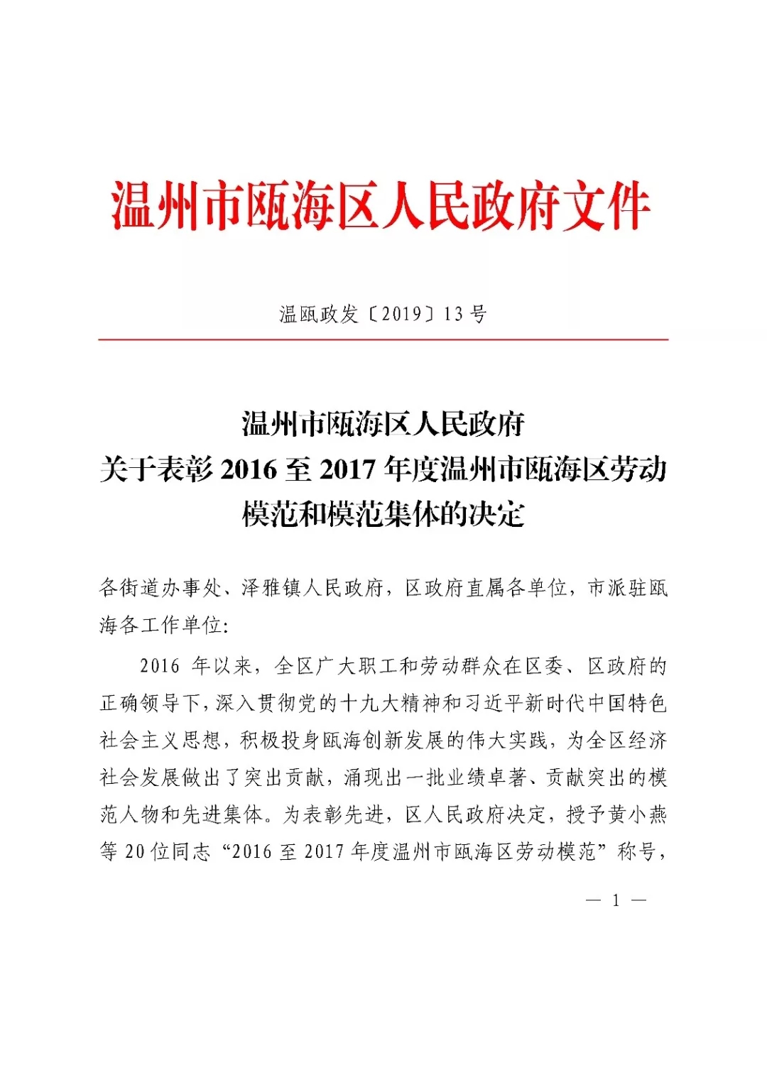 3月30日,甌海區(qū)人民政府發(fā)布溫甌政發(fā)(2019)13號文件對2016-2017年度區(qū)勞動模范及模范集體進行表彰。浙江海派醫(yī)藥有限公司因業(yè)績卓著、貢獻突出成為受表彰的五個集體之一。