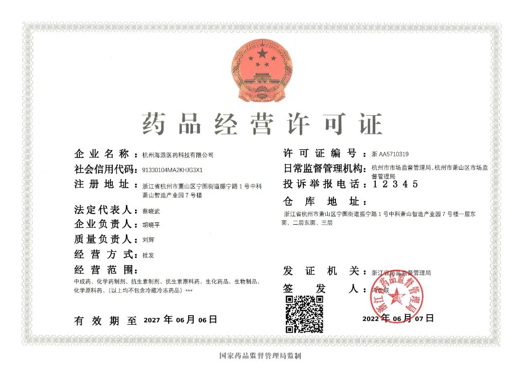 6月7日,經(jīng)杭州市市場監(jiān)管局現(xiàn)場驗收檢查,海派醫(yī)藥集團下屬子公司——杭州海派醫(yī)藥科技有限公司,正式取得了由浙江省藥品監(jiān)督管理局頒發(fā)的《藥品經(jīng)營許可證》。標志著海派醫(yī)藥“雙總部”模式的正式落地。